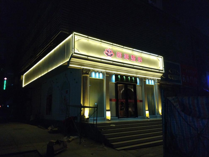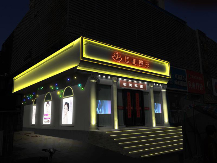 安徽極光照明工程有限公司對恒美整形的亮化範圍為麵向金(jīn)寨路的門頭亮化以及麵向長江路的側(cè)門夜景亮化部分。為滿足客戶要求,經反複(fù)與(yǔ)夏總溝通後,設計師根據自己對醫院類工程的亮化經驗(yàn),誕生了本次亮化的效果圖。