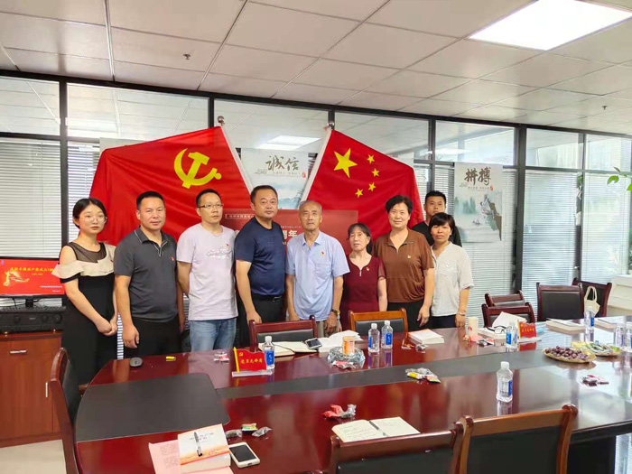 施(shī)成貴董事長與官塘馮書記、王書記及公司黨員合影: